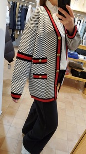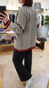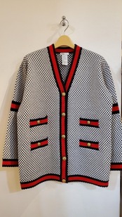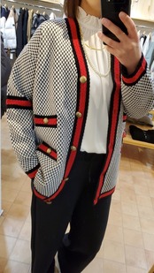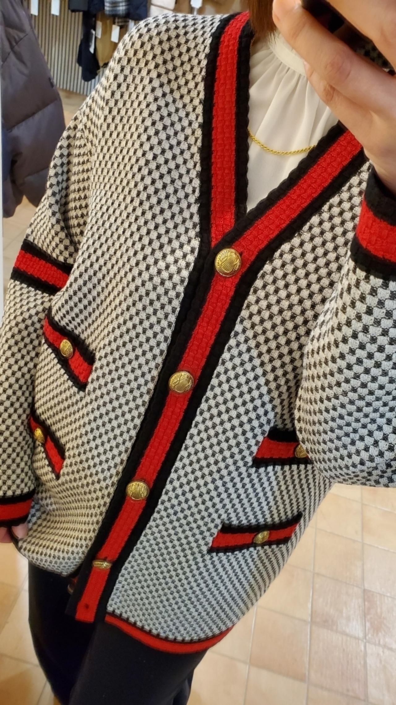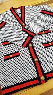ツイード見えする白×黒の格子柄編みに赤の配色ラインがポイントに◇ヴィンテージなオリジナルボタンもアクセサリーのように引き立ててくれます。