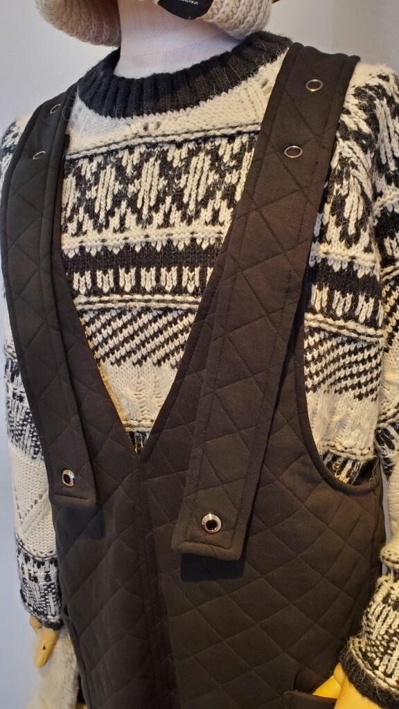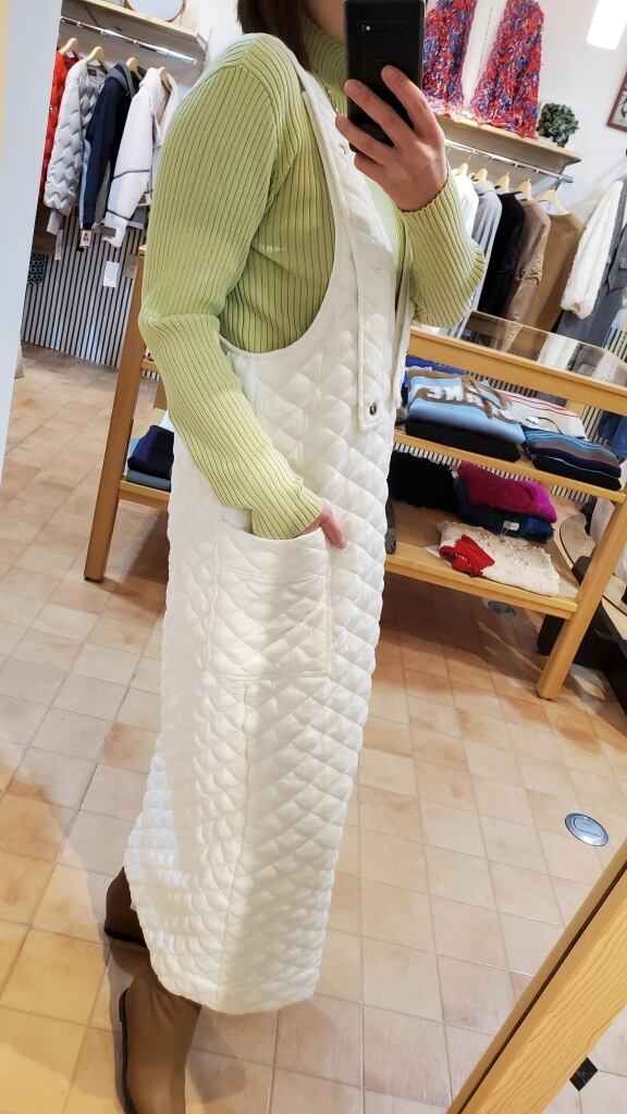 深いVネックで可愛いキルティングの雰囲気を大人に仕上げたデザインに。ボックスのⅠラインシルエットですっきりとしたカジュアルスタイルを完成させてくれる大人のジャンスカです。