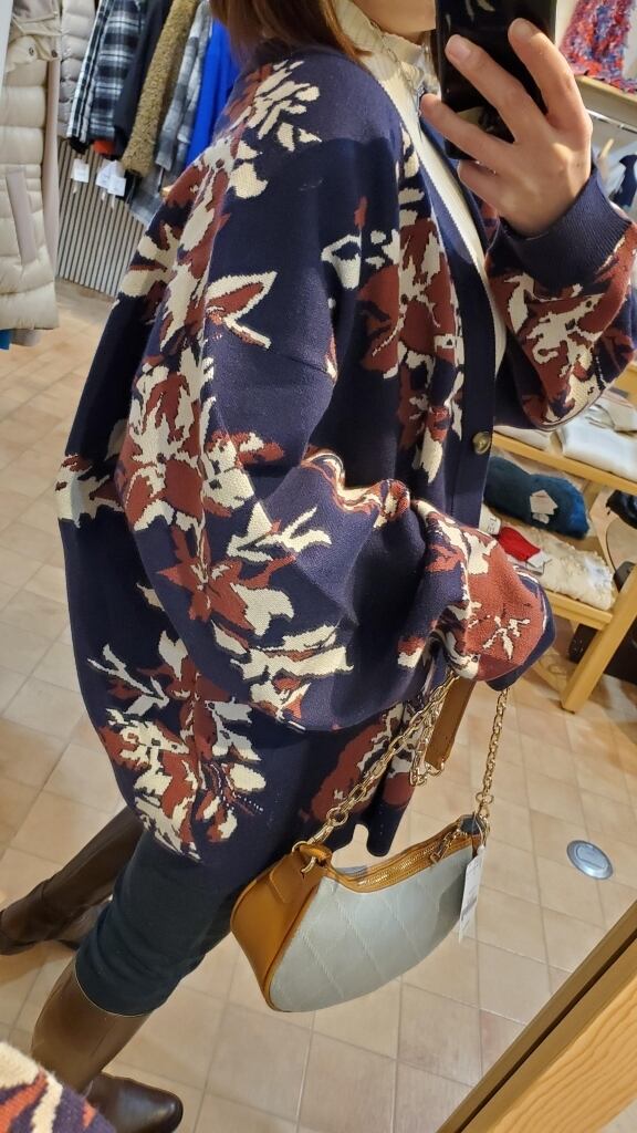 大きめの花柄ジャガードで見映え感たっぷりなオーバーサイズカーディガンです。